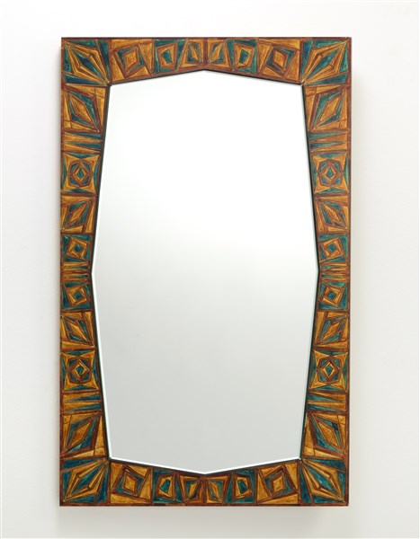Lotto 533 | Specchio da parete con cornice in vetro retroverniciato policromo. (cm 58x97,5)