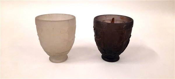 Due vasi in vetro soffiato in stampo ametista e incolore acidati e decorati in basso rilievo con scene classicheggianti. Francia, prima metà secolo XX. Firmati sotto la base. (h cm 14) (difetti)