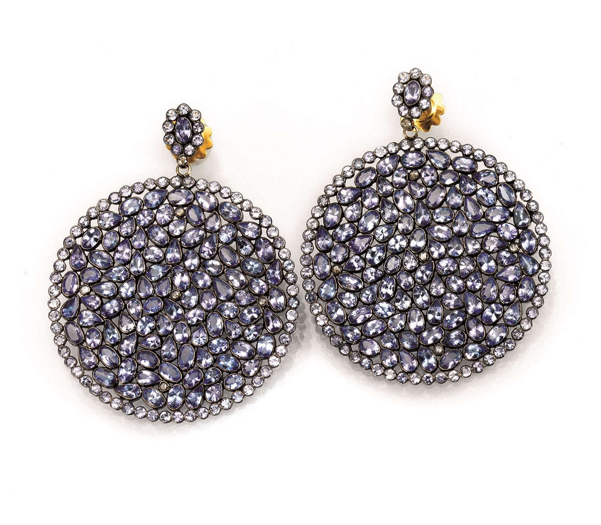 ciascuno realizzato con una piccola corolla in tanzaniti di taglio circolare e ovale a cui è sospeso un grande disco traforato interamente decorato in tanzaniti per ct 15 e piccoli brillanti