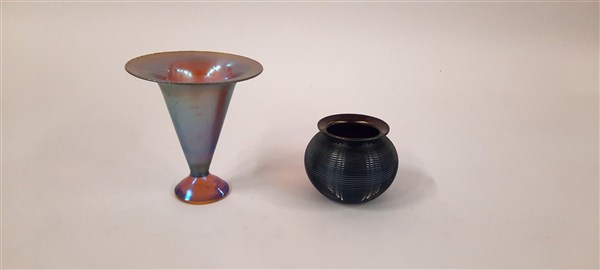 Lotto composto da un vasetto in vetro iridescente con base in vetro trasparente