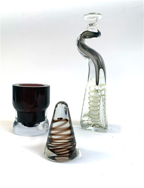 Lotto composto da un centrotavola in vetro massello trasparente e ametista, un portacandele in vetro sommerso, firmato e datato a punta sotto la base e un fermacarte in vetro sommerso trasparente incolore con spirale ametista. (misure diverse)