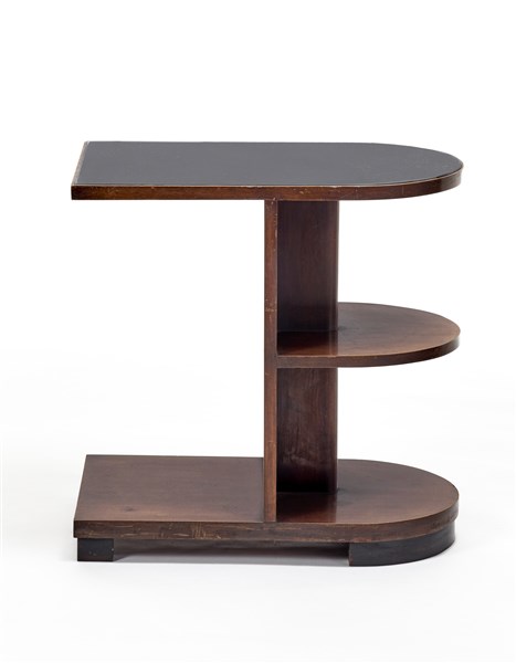 Tavolino Novecento in legno massello, bordato e impiallacciato con lato semicir