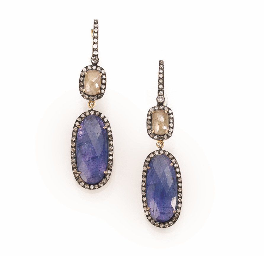 Paio di orecchini pendenti in oro giallo, tanzanite e diamanti