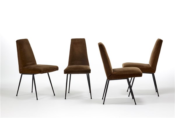 Lotto di quattro sedie con struttura in acciaio verniciato nero, seduta e schienale imbottiti e rivestiti in velluto marrone. Italia, anni '50. (cm 40x89x58) (lievi difetti)