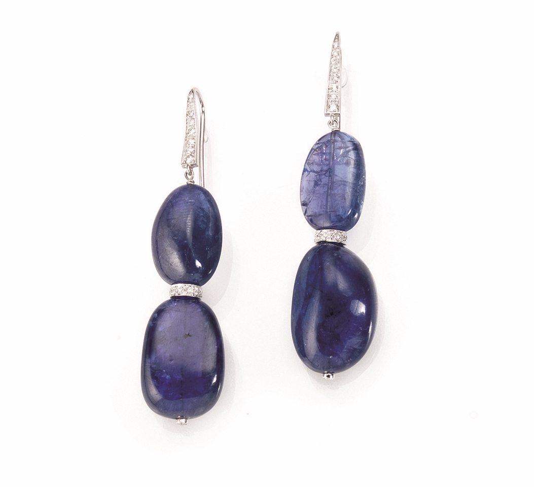ciascuno realizzato con una monachella decorata in brillanti a cui sono sospese due tanzaniti ovali poste in gradazione intercalate da un piccolo anello in brillanti