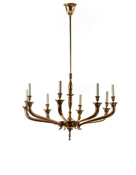 Stilnovo (Attribuito) Lampadario a otto braccia. Milano, anni '40. Ottone sagoma