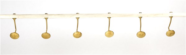 Appendiabiti da parete a sei pomoli in fusione di ottone, con grande mensola-cappelliera da incasso in marmo bianco venato. Milano, anni '40. (cm 173,5x35)