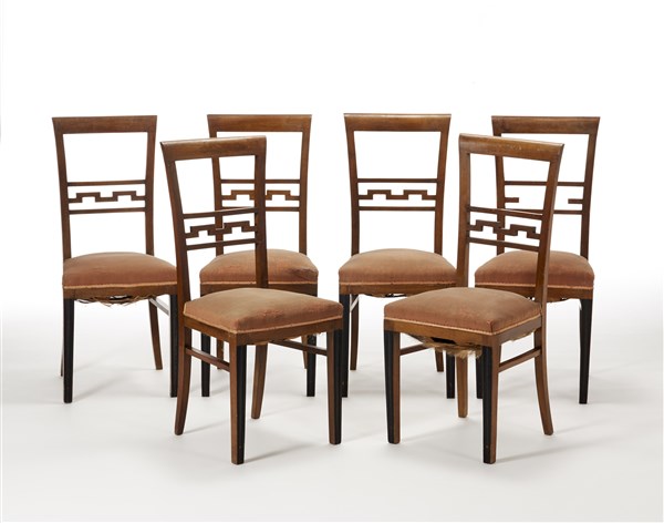 Gruppo di sei sedie Stile Novecento in legno di mogano massello con schienale a giorno, cartella traforata, gambe rastremate. Italia, anni '30. (cm 44x101x47,5) (difetti e mancanze)