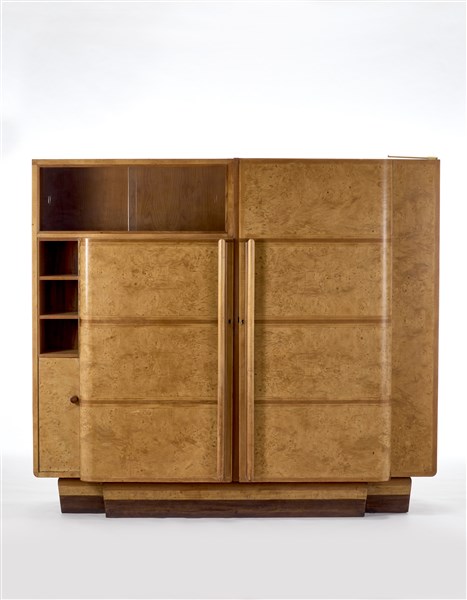 Armadio Novecento a due ante, piccolo stipo, vani a giorno e vetrinetta. Struttura in legno massello, bordato e impiallacciato in radica. Italia, anni '30. (cm 208x184,5x50) (difetti)