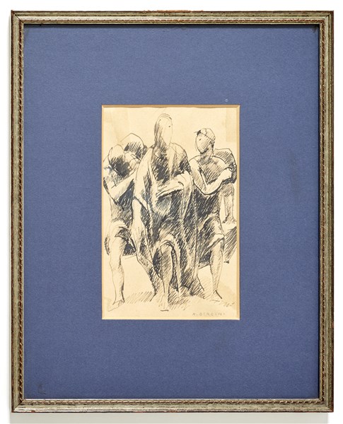 Studio per tre figure maschili. Roma, anni '30/'40. Inchiostro di china su carta. Firmato "A. BIAGINI" in basso a destra. (cm 20.5x12,5). In cornice.