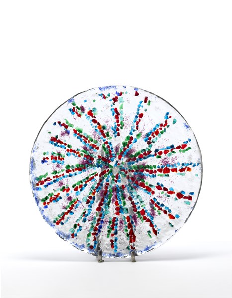Piatto-scultura in vetro massello trasparente incolore con superficie corrugata e inclusione di murrine rosse, verdi, turchese e blu. Murano, 1977. Firmato e datato a punta. Montato su supporto metallico. (d cm 33,5)