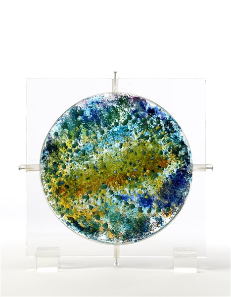 Piatto-scultura in vetro massello trasparente incolore con superficie corrugata e inclusione di murrine policrome. Murano, anni '70. Firmato e datato a punta. Montato su supporto in metacrilato. (d cm 33)