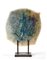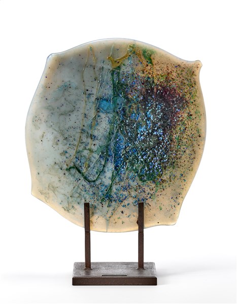 Scultura in vetro lattimo con applicazioni a caldo in vetro verde, blu, azzurro, giallo. Murano, anni '70. Montata su supporto in metallo con etichetta dell'artista. (cm 35x33) (difetti)