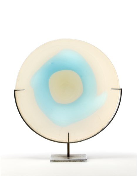 Coprifuoco circolare in vetro lattimo e azzurro. Murano, anni '70. Montato su supporto in metallo con firma dell'autore. (d cm 56,5) (lievi difetti)