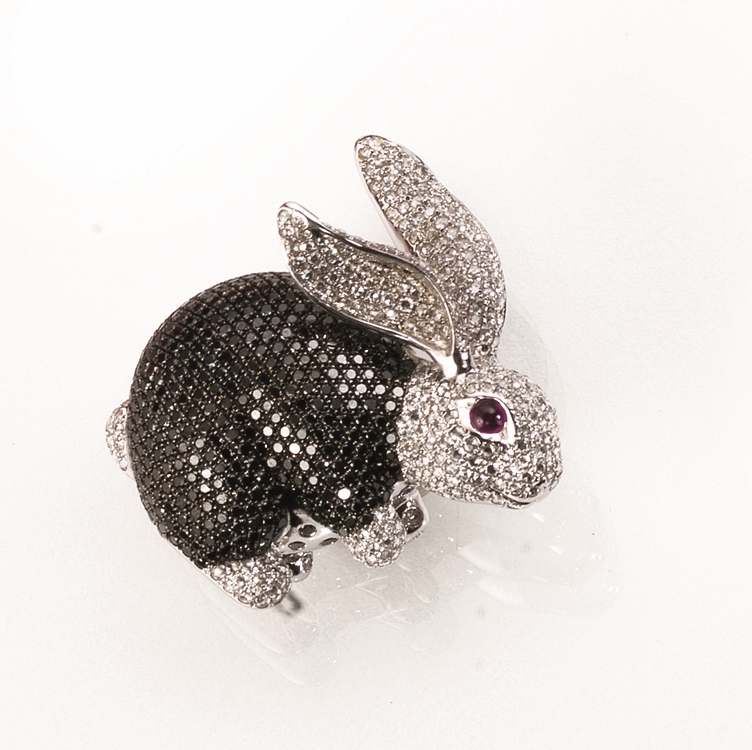 realisticamente modellato come una coniglio e decorato in pavè di brillanti bianchi e neri per ct 4 circa, occhio in rubino cabochon, g 17, corredato di catena a maglia sottile in oro bianco