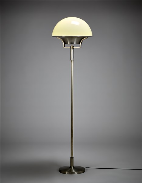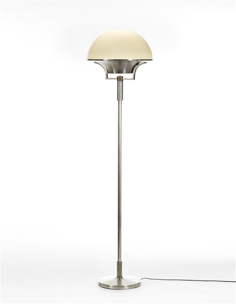 Lampada da terra con struttura in metallo e diffusore semisferico in vetro lattimo. Italia, anni '70. (h cm 170) (lievi difetti)