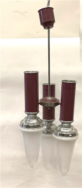 Lampada a sospensione a tre luci con struttura in metallo verniciato bordeaux.