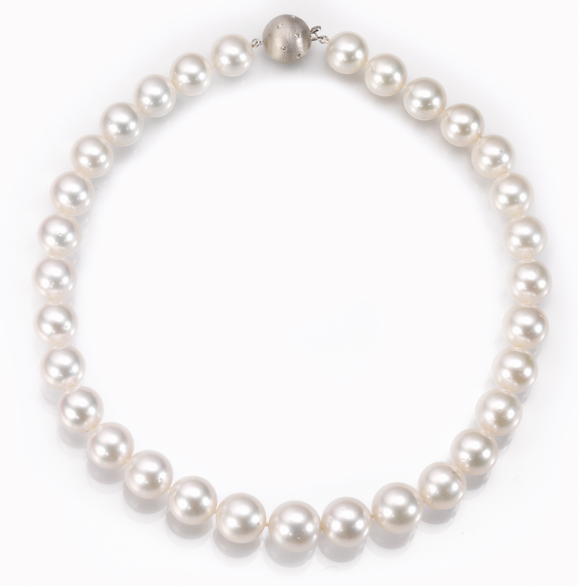 realizzata ad una fila di perle diam. mm 18, fermatura a sfera in oro bianco satinato punteggiata da piccoli brillanti, lungh. cm 49,5, g 145