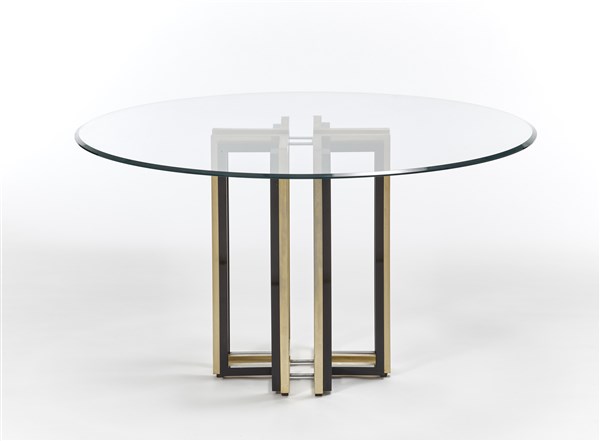 Tavolo con base in metallo verniciato nero e dorato, piano in cristallo. Italia