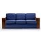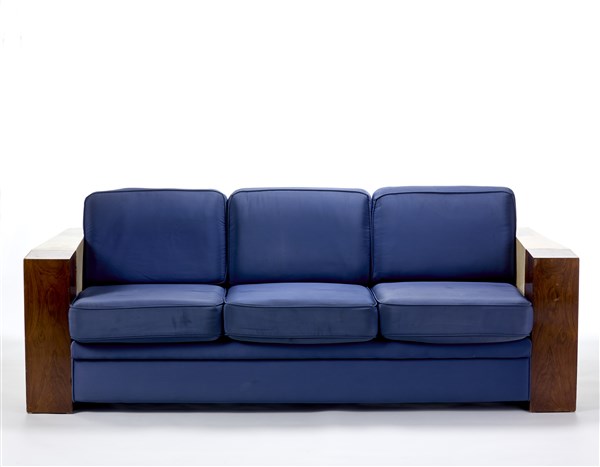 Divano di gusto déco a tre posti con struttura in legno impiallacciato e pergamena, seduta e schienale imbottiti e rivestiti in tessuto blu. Italia, secolo XX. (cm 229x65,5x76,5) (lievi difetti e restauri)