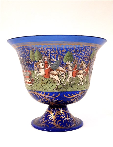 Coppa in vetro soffiato blu smaltata con fregi dorati e in policromia con figure a cavallo e figure femminili alla fontana. Murano, secolo XX. (h cm 19; d cm 22)