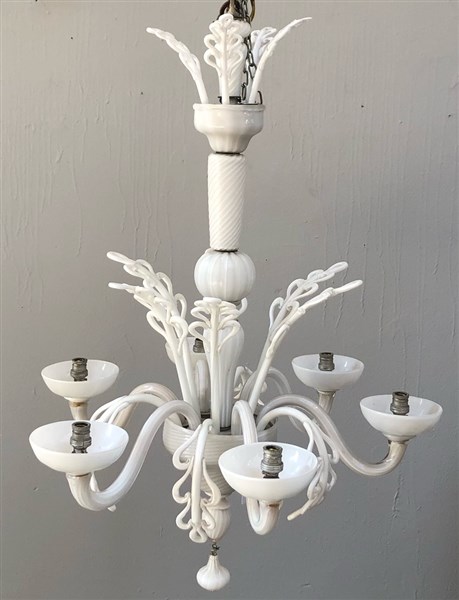 Manifattura di Murano Lampadario a sei luci in vetro lattimo con decoro a fogli