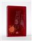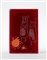Scultura in vetro massello rosso scuro graffita con figure e dipinta con due soli arancioni. Siglata sul fianco. (cm 14,5x22,5x4)