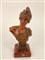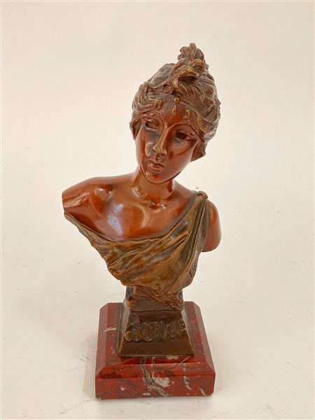 Mezzo busto femminile in bronzo patinato poggiante su base in marmo rosso. Franca. Firma al fianco, timbro della Société des bronzes de Paris. (h cm 28)