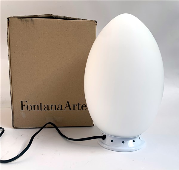 Lampada da tavolo modello "Uovo piccola 2646/0". Produzione Fontana Arte, Milano, produzione recente. Alluminio laccato bianco e vetro bianco satinato. In scatola originale. (h cm 30)
