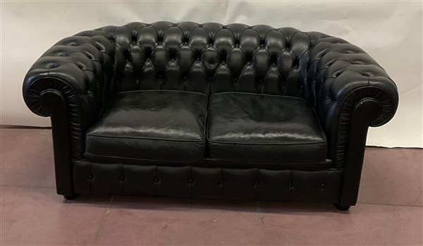 Divano Chester a due posti imbottito e rivestito in pelle nera. (cm 160x66x80) (lievi difetti)