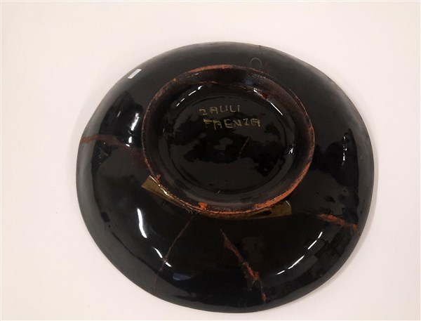 Ciotola in ceramica smaltata nei toni del bruno/arancio e blu con riflessi metallici e decori informali a rilievo. Faenza, anni '50/'60. Iscritto sotto la base "ZAULI FAENZA". (d cm 32) (difetti e restauri)