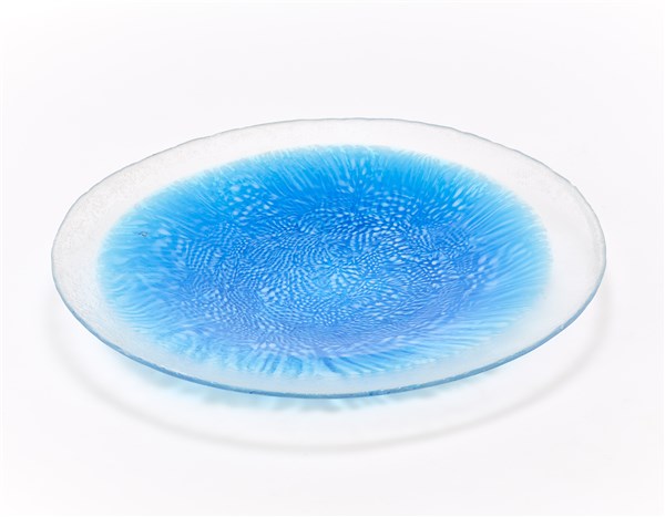 Piatto. Murano, anni '60/'70. Vetro trasparente incolore acidato con parte centrale a murrine azzurre. (h cm 33) (lievi difetti e restauri)