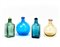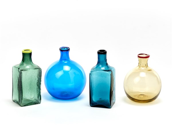 Lotto composto da due bottiglie di forma quadrangolare e due vasi sferici in vetro verde, blu e pagliesco con orlo applicato. Murano, anni '60/'70. Firmati a punta sotto la base. (h max cm 9)