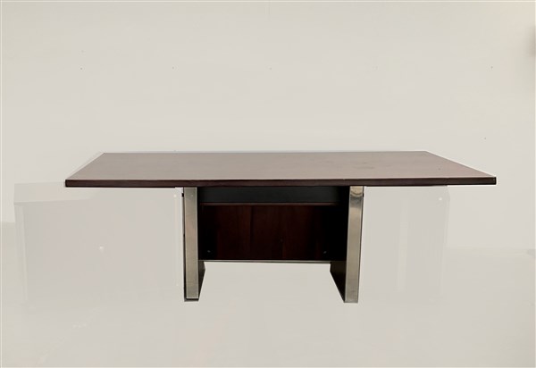 Scrivania dirigenziale della serie "Galileo". Roma, anni '50/'60. Legno e acciaio. Recante marchio di produzione. (cm 220x76,5x110) (difetti e mancanza delle chiavi e delle cerniere di collegamento)