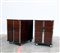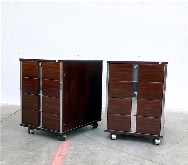 Coppia di mobiletti componibili su rotelle a quattro cassetti della serie "Galileo". Roma, anni '50/'60. Legno e acciaio. Recanti marchio di produzione. (cm 45x64x60) (difetti e mancanza delle chiavi e delle cerniere di collegamento)