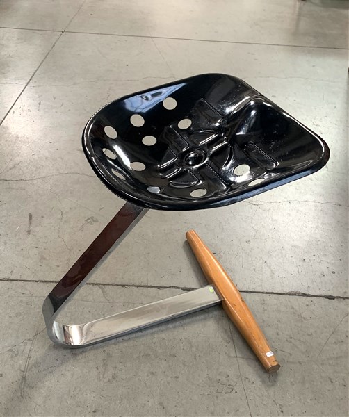 Seduta della serie "Mezzadro". Produzione Zanotta, Nova Milanese, 1957. Gambo in acciaio cromato, sedile in acciaio verniciato nero e base in faggio. Marcata a incussione sotto il gambo. (cm 49x61x49) (lievi difetti)