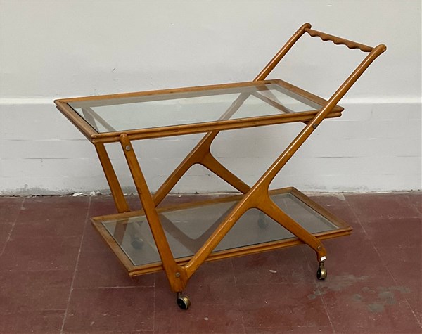 Carrello portavivande a due ripiani. Italia, anni '50. Legno chiaro massello, piani in cristallo. (cm 88x71x43) (lievi difetti)