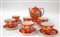 Servizio da te composto da sei tazzine, sei piattini e una teiera. Mosca, disegno anni '50, esecuzione anni '80. Porcellana bianca, arancio, verde, gialla, rosa e dorata. Marcato e numerato sotto la base. (lievi difetti)