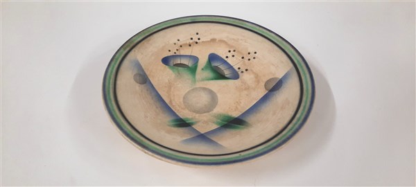 Piatto in terraglia firmata a colaggio e smaltata in blu, verde, bronzo e beige all'aerografo con motivi geometrici e floreali tipici del periodo della Repubblica di Weimar. Germania, 1920ca. Marcato sotto la base in verde con il simbolo grafico della manifattura e la dicitura "Made in Saar-Basin" e con i numerali 6603 in verde, BM 48 e 3/47 1 incussi. (d cm 29,5) (lievi difetti)