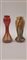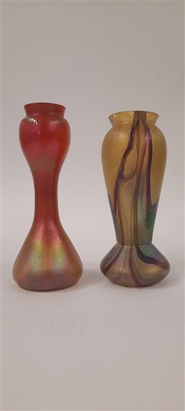 Lotto di due vasi bulbiformi a corpo allungato in vetro incolore e rosso con superficie iridescente rispettivamente rossa e verde, maculata in vinaccia. 1910ca. (h max cm 24)