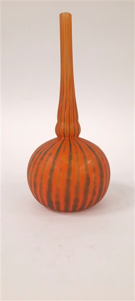 Vasetto bulbiforme a collo stretto e allungato in vetro soffiato a striature verticali verde e arancione. Francia, prima metà secolo XX. Firmato Daum Nancy e con la croce di Lorena. (h cm 24)