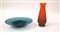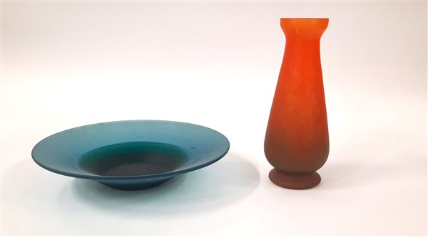 Lotto composto da un centrotavola in pasta vitrea azzurra unita a un vaso in pasta vitrea arancio. Secolo XX. (centrotavola cm h 7,5 x d cm 33; vaso cm cm h 28)) (lievi difetti)