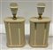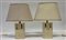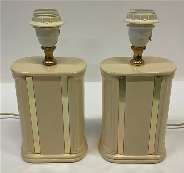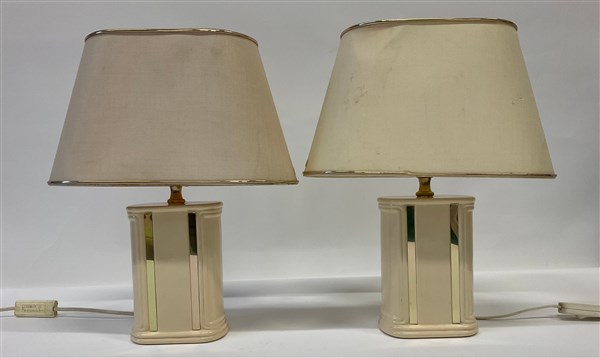 Coppia di lampade da tavolo. Francia, anni '70. Ceramica smaltata bianca e ottone, paralume in tessuto créme. (h cm 32)