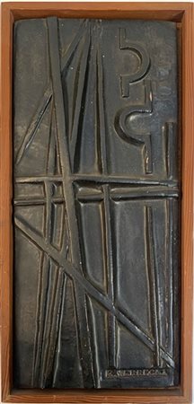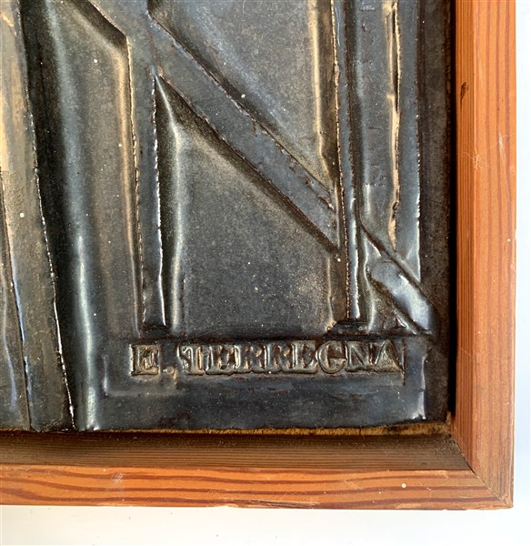 Placca in terracotta smaltata anthracite in cornice. Faenza, seconda metà secolo XX. Firmato in basso a destra Eusanio Terregna. (cm 22x50) (lievi difetti)
