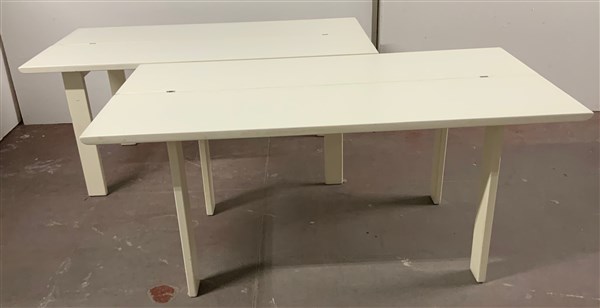 Tavolo in legno smaltato bianco sdoppiabile in due singoli sovrapponibili con piani ad alette. Italia, anni '70/'80. (cm 160x74x80) (difetti)
