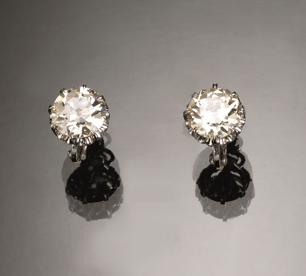 ciascuno costituito da un brillante di ct 6,50 circa, taglio vecchio, montatura in oro bianco traforato, g 10, en suite con l'anello