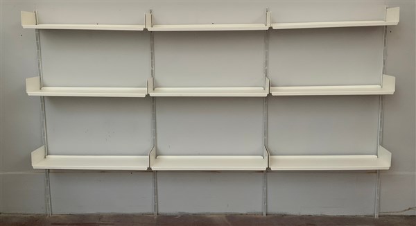 Libreria pensile a tre campate in metallo verniciato bianco con ripiani a giorno. Italia, anni '70/'80. (cm 274x171x26)(lievi difetti)