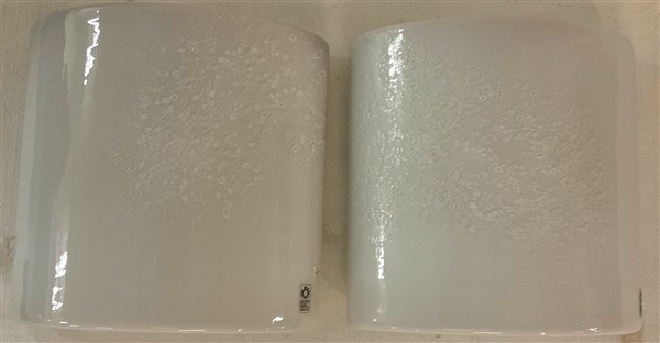* Coppia di lampade da parete o da soffitto della serie "Idra". Esecuzione Leucos, Murano, 1980. Vetro soffiato in stampo incamiciato lattimo con murrine. (cm 33x32x11)