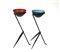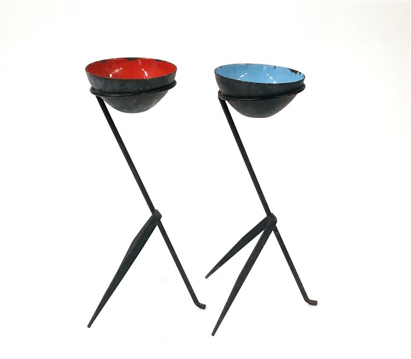 Due posacenere da poltrona con struttura in ferro e coppette in metallo smaltato rosso e azzurro. Anni '50/'60. (h cm 38; d cm 13) (difetti)