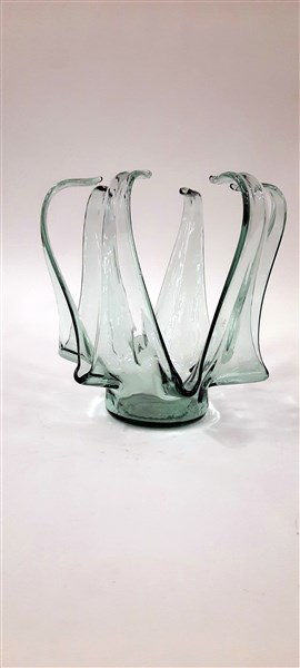 Fruttiera in vetro stampato azzurrino. Seconda metà secolo XX. (h cm 23; d cm 22)